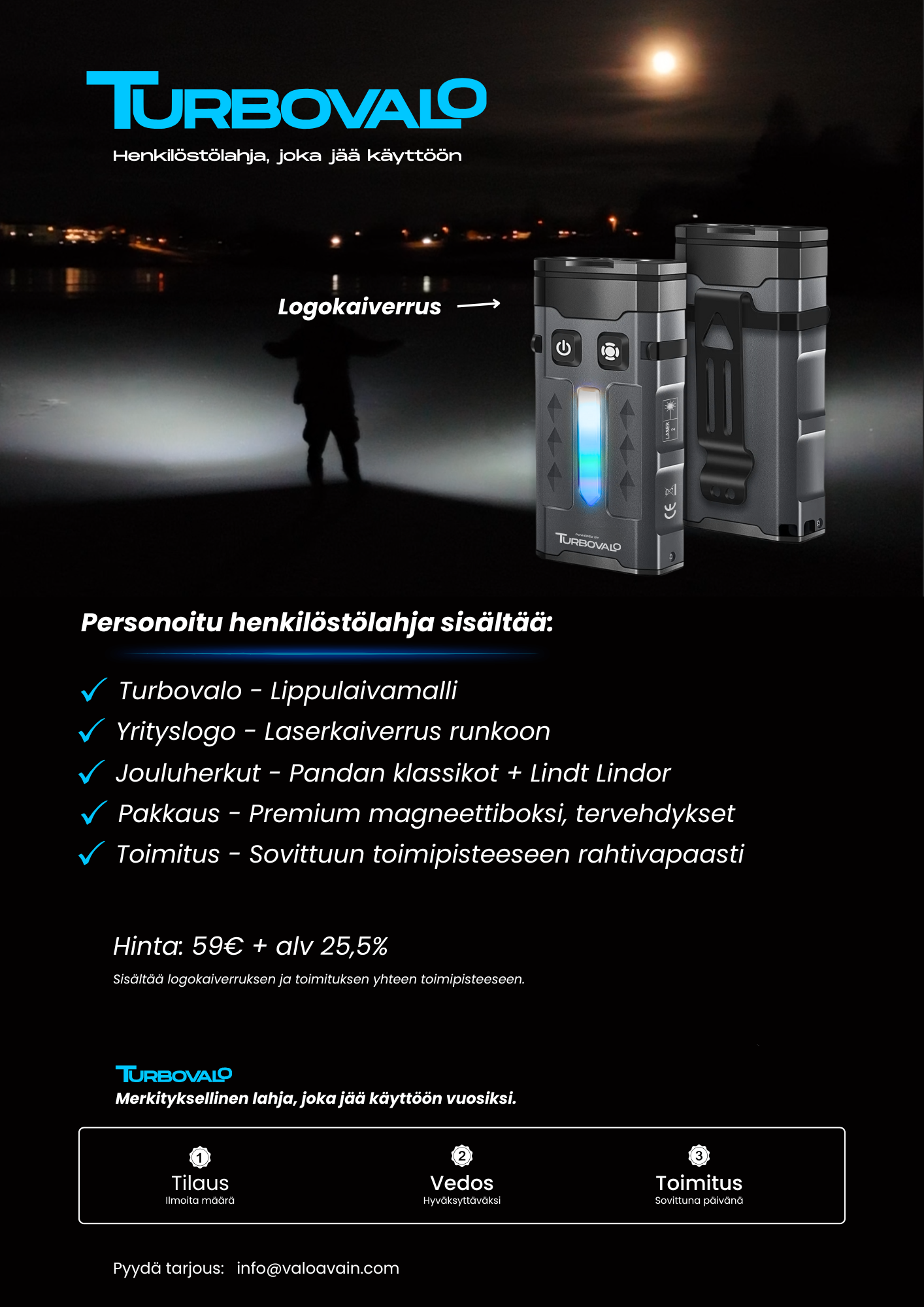Olit sitten pimeällä ajamassa, koiran kanssa lenkillä tai muuten vain tarvitset pientä JA tehokasta valoa - Turbovalo on täydellinen valinta.